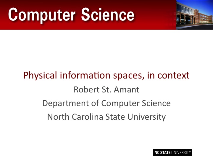 These slides were for a presentation to the Center for Research and Development of Digital Libraries at the University of North Carolina. The talk was about Physical information spaces, in context, which is probably a bit too general, but I was covering a good deal of ground.